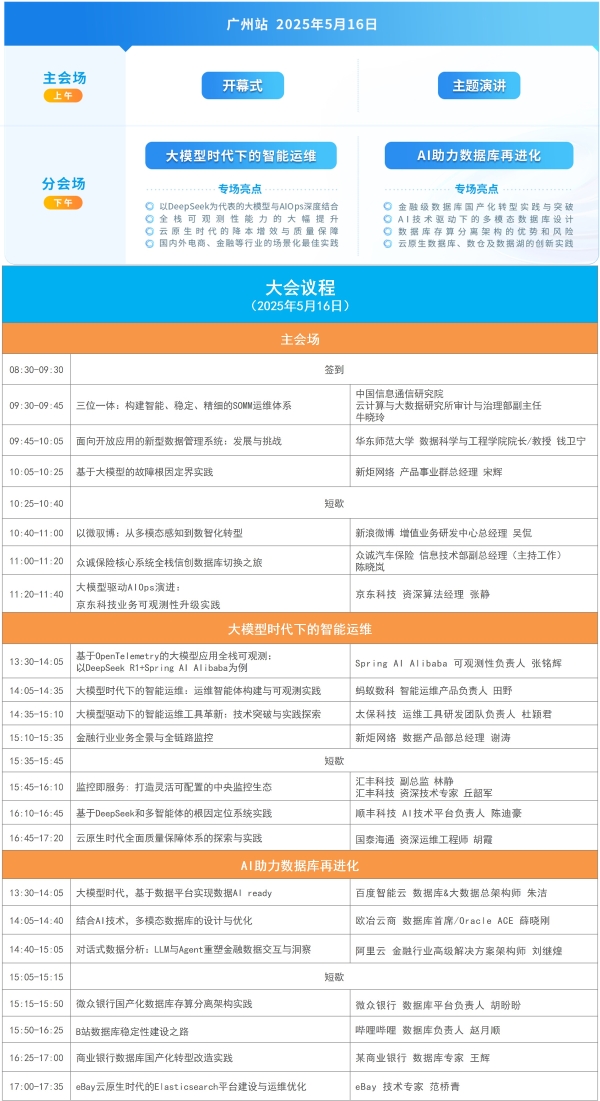 本次大会将聚焦于大模型、AI Agent等新兴技术推动及融合之下,运维与数据库两大领域的发展趋势和创新应用。目前大会演讲嘉宾和分享议题已全部上线,来自中国信通院、阿里云、京东科技、百度智能云、蚂蚁数字科技、新浪微博、哔哩哔哩、eBay、顺丰科技、微众银行、汇丰科技、太保科技、国泰海通、众诚汽车保险、新炬网络、欧冶云商、华东师范大学等产学研单位的技术代表将带来不容错过的精彩干货,以下带大家先睹为快:
