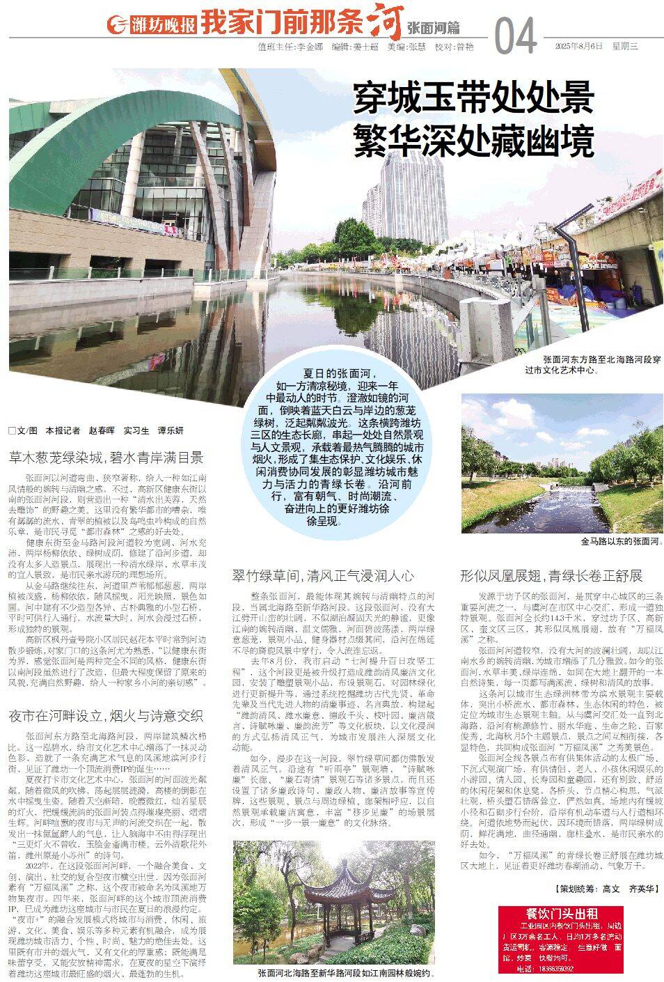 新派讯一半烟火入世间,一半诗意许清欢。发源于坊子区的张面河,是贯穿潍坊市中心城区的三条重要河流之一,与虞河在市区中心交汇,形成一道独特景观。张面河全长约14.3千米,穿过坊子区、高新区、奎文区,其形似凤凰展翅,故有“万福凤溪”之称,其河道较窄,没有大河的波澜壮阔,却以江南水乡般的婉转清幽,为城市增添了几分雅致。它串联起一处处自然与人文景观,承载着热气腾腾的城市烟火,形成了集生态保护、文化娱乐、休闲消费协同发展的青绿长卷。沿着这条河走下来,定会读出一个富有朝气、时尚潮流、绿意盎然、奋进向上的更好潍坊。