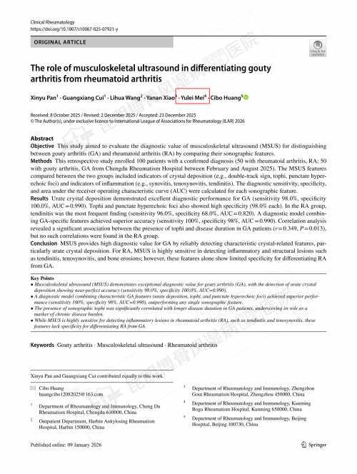 近日,由昆明博骨风湿病中西医结合医院痛风专科门诊梅雨蕾主任参与研究,题为《肌肉骨骼超声在鉴别痛风性关节炎与类风湿关节炎中的作用》的论文,在国际风湿病学知名期刊《Clinical Rheumatology》(《临床风湿病学》)上发表。该研究借助对比分析手段,全面研判了肌肉骨骼超声(MSUS)对中国患者中这两种常见关节炎的鉴别价值,为临床实现精准诊断筑牢了影像学支撑。